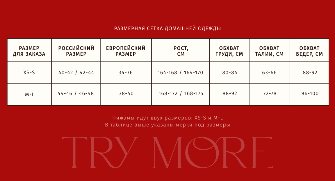 Размерная сетка домашней одежды